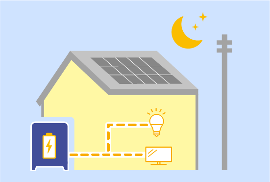 蓄電池の併用で、さらに夜の電気代も節約! 昼間に余った電気を蓄電池にためて、夜間も電気を賢く使えます。注10)注10)昼間の太陽光による発電量やお客さまの電気のご使用状況によっては夜間の電気代節約効果が得られない場合があります。