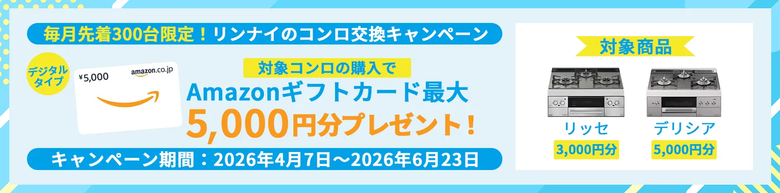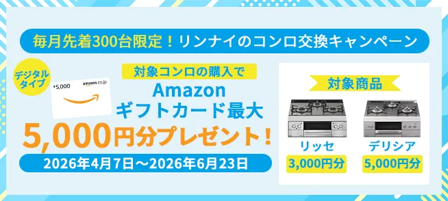 毎月先着300台限定!リンナイの対象コンロへ交換でもらえる!Amazonギフトカード最大5,000 円分プレゼントキャンペーン