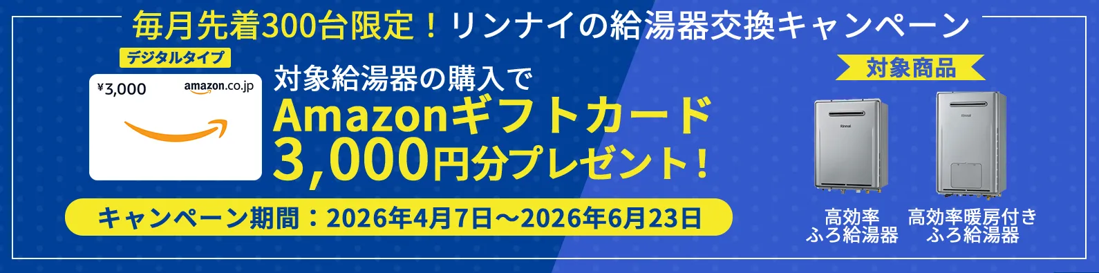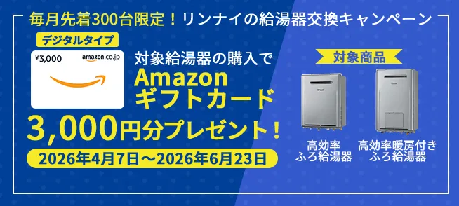 毎月先着300台限定!リンナイの対象給湯器へ交換でもらえる!Amazonギフトカード3,000円分プレゼントキャンペーン