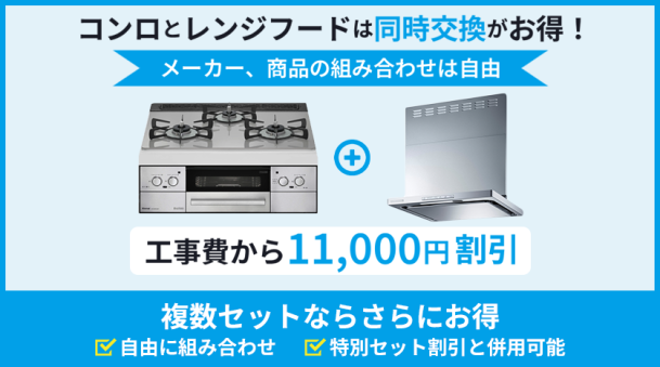 コンロとレンジフード、キッチンと浴室の組み合わせの場合には、特別セット割引として11,000円(税込)あるいは22,000円(税込)を工事費から割引します。この機会にキッチン設備をまとめて新しくしたり、お時間のかかるキッチンとお風呂をまとめて交換するなどご検討ください。