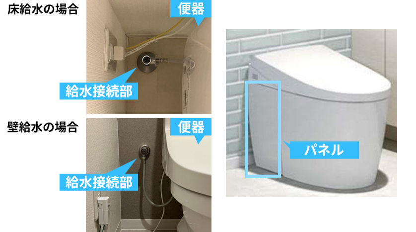 トイレ背面に収納があり、給水配管が背面収納に隠れている場合はお受けできませんのでご注意ください。