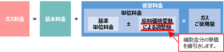 ガスは、単位料金を算定する際の「原料価格変動額による調整額」から補助金分を差し引いております。