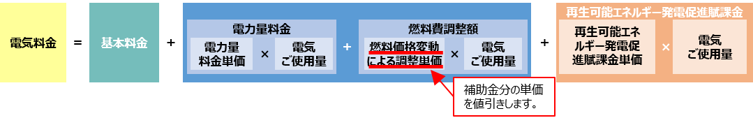 電気は、燃料費調整額を算定する際の「燃料価格変動による調整単価」から補助金分を差し引いております。